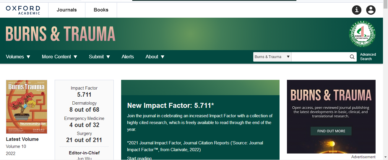 今天,我们来看看这本SCI期刊:Burns & Trauma。从现有的记录来看,Burns & Trauma 的2022年影响因子(JCR2021)是5.711,2021年影响因子5.099,2020年影响因子3.088。