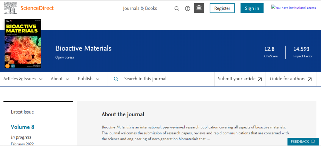 今天,我们来看看这本SCI期刊:Bioactive Materials。从现有的记录来看,Bioactive Materials 的2021年影响因子(JCR2020)是14.593,2020年是8.724,比2020年增长5.869,增长比例67.27%。