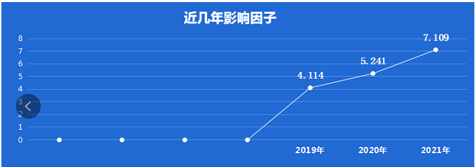 2019年获得第一个影响因子为4分+,2020年突破5分,2021年影响因子上升至7分+,2021影响因子为7.109,作为新刊还是很不错的。