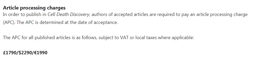 在Cell Death Discovery发表的文章均为开放获取,需要支付1790 英镑/2290 美元/1990 欧元的文章处理费,折合人民币约为13775元(欧元兑人民币),价格相对来说比较实惠,如果需要申请APC 豁免和折扣的需要在提交手稿过程中一并提交。