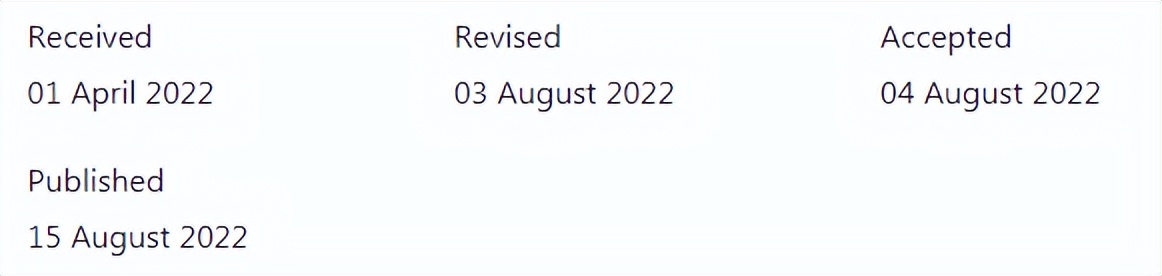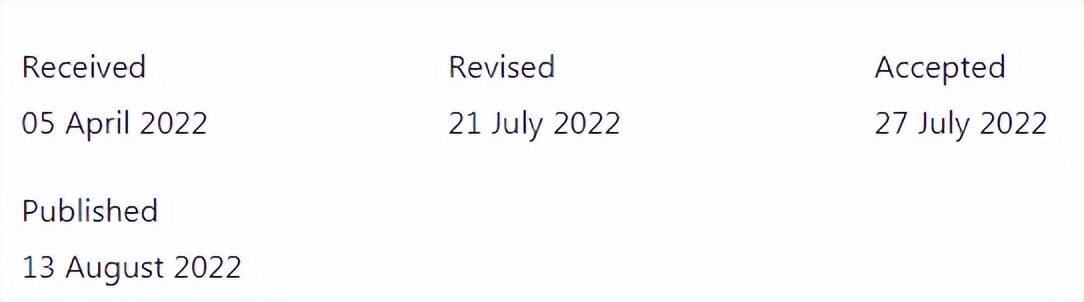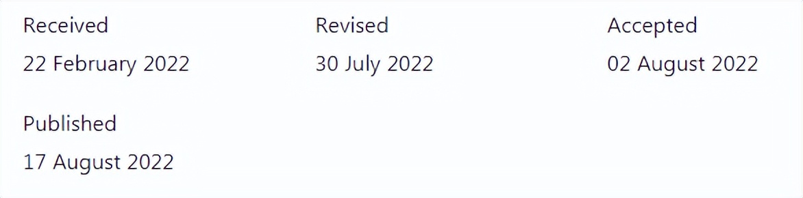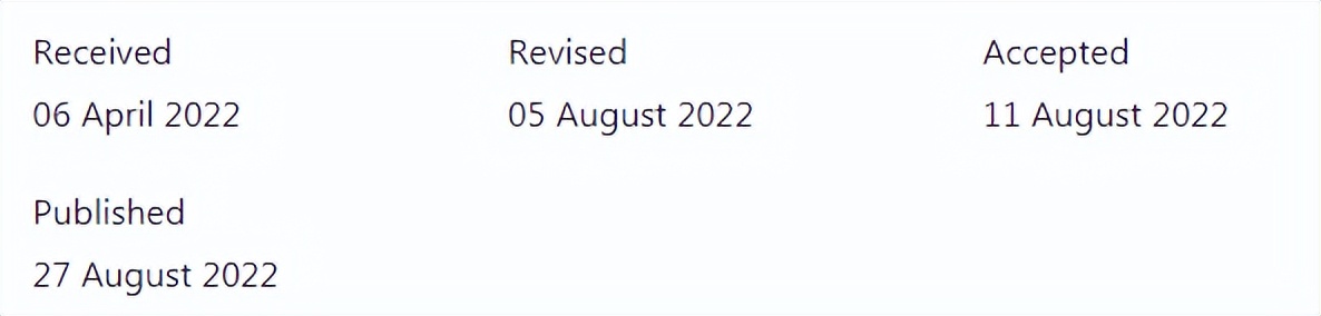 经验分享4:这个杂志速度很快,是一个看涨的杂志,文章质量很好。投稿时间:20210105 manuscript received,editor assigned. 20210108 manuscript under consideration. 20210203 decision made,decision sent to author 20210204 major revision,只有一个审稿人,意见主要是语言的问题和图注的问题。给了一个月的修改时间。20210225 re-submit,editor assigned. 20210305 under consideration. 20210309 decision made. 20210310 decision sent to author,accepted.