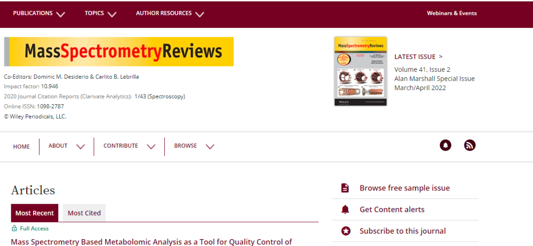 今天,我们来看看这本SCI期刊:MASS SPECTROMETRY REVIEWS。从现有的记录来看,MASS SPECTROMETRY REVIEWS 的2021年影响因子(JCR2020)是10.946,2020年是8.887,比2020年增长2.059,增长比例23.17%。