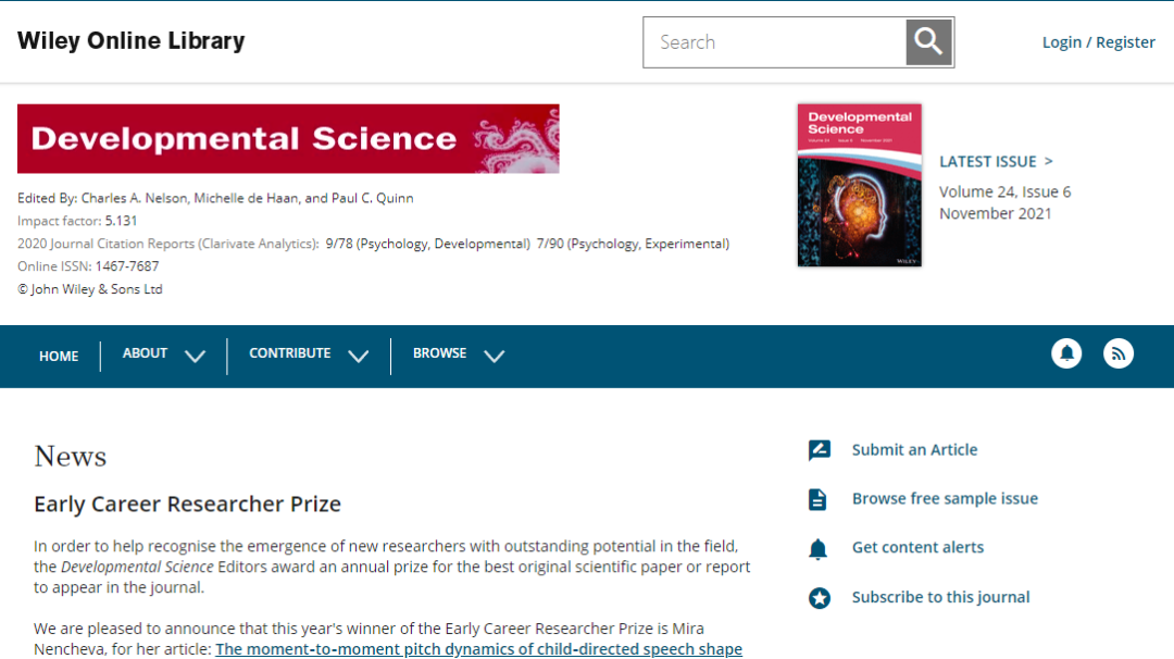 今天,我们来看看这本SCI期刊:DEVELOPMENTAL SCIENCE。从现有的记录来看,DEVELOPMENTAL SCIENCE 的2021年影响因子(JCR2020)是5.131,2020年是3.722,比2020年增长1.409,增长比例37.86%。