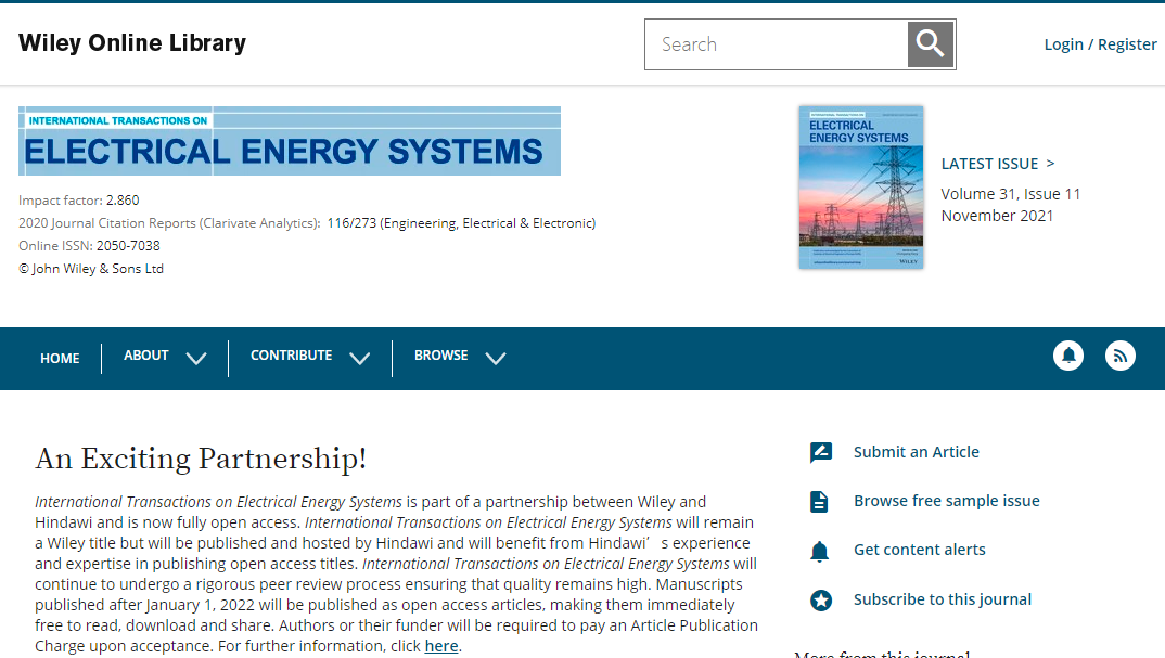 International Transactions on Electrical Energy Systems publishes original research results on key advances in the generation, transmission, distribution, and conversion of electrical energy systems. Of particular interest are submissions concerning the modeling, analysis, optimization, and control of advanced electric power and energy systems, grid-connected power electronics converters, and renewable energy integration. Surveys or review of existing work on electrical energy systems may also be considered for publication.