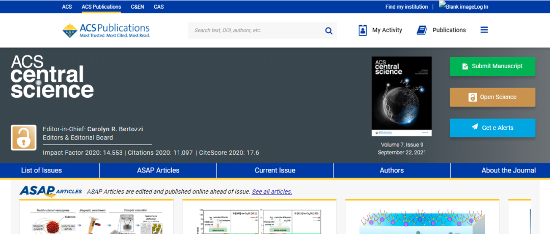 今天,我们来看看这本SCI期刊:ACS Central Science。从现有的记录来看,ACS Central ScienceY 的2021年影响因子(JCR2020)是14.553,2020年是12.685,比2020年增长1.868,增长比例14.73%。