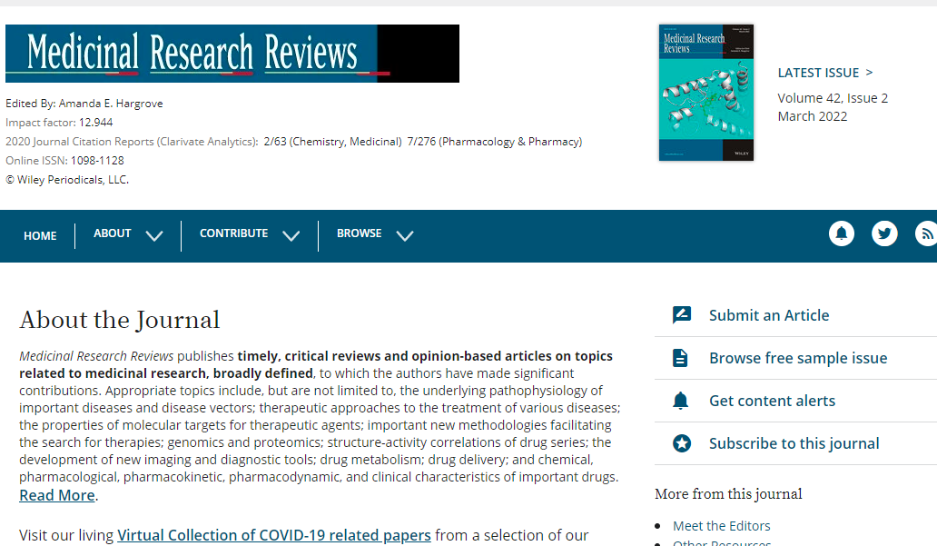 今天,我们来看看这本SCI期刊:MEDICINAL RESEARCH REVIEWS。从现有的记录来看,MEDICINAL RESEARCH REVIEWS 的2021年影响因子(JCR2020)是12.944,2020年是9.300,比2020年增长3.644,增长比例39.18%。