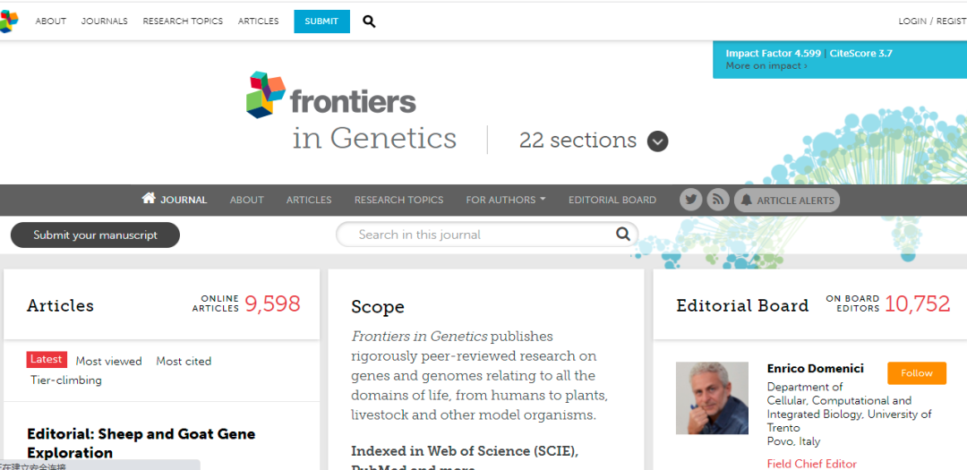 今天,我们来看看这本SCI期刊:Frontiers in Genetics。从现有的记录来看,Frontiers in Genetics 的2021年影响因子(JCR2020)是4.599,自引率5.00%。