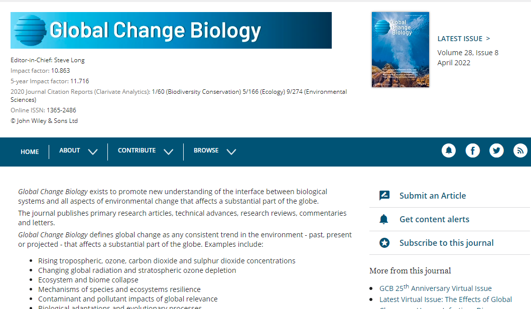 今天,我们来看看这本SCI期刊:GLOBAL CHANGE BIOLOGY。从现有的记录来看,GLOBAL CHANGE BIOLOGY 的2021年影响因子(JCR2020)是10.863,2020年是8.555,比2020年增长2.308,增长比例26.98%。
