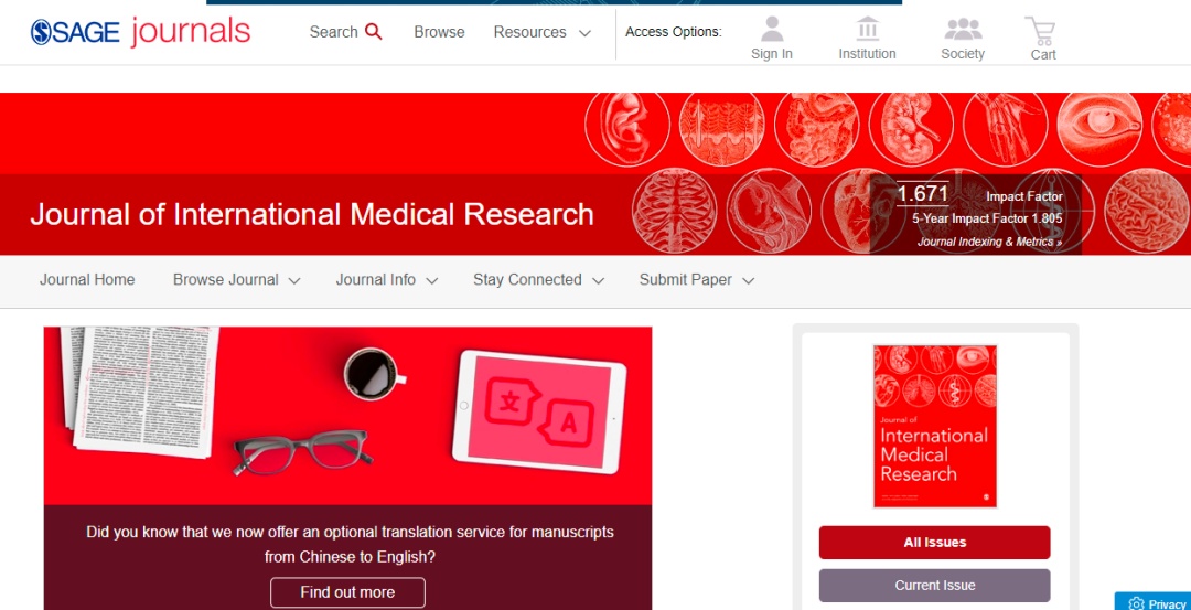 今天,我们来看看这本SCI期刊:JOURNAL OF INTERNATIONAL MEDICAL RESEARCH。从现有的记录来看,JOURNAL OF INTERNATIONAL MEDICAL RESEARCH 的2021年影响因子(JCR2020)是1.671,自引率3.47%。