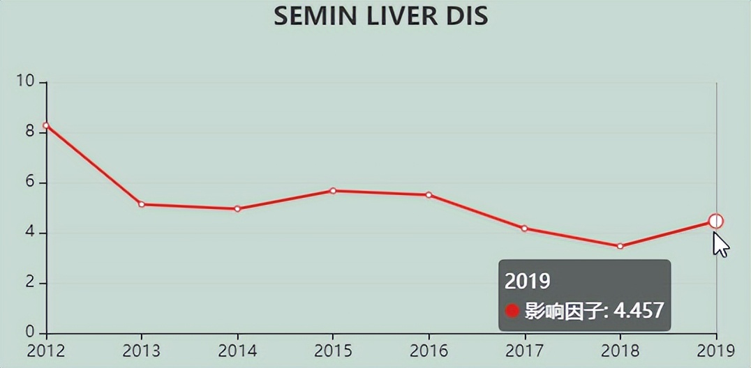 今天,我们来看看这本SCI期刊:SEMINARS IN LIVER DISEASE。从现有的记录来看,SEMINARS IN LIVER DISEASE 的2021年影响因子(JCR2020)是6.115,2020年是4.457,比2020年增长1.658,增长比例37.20%。