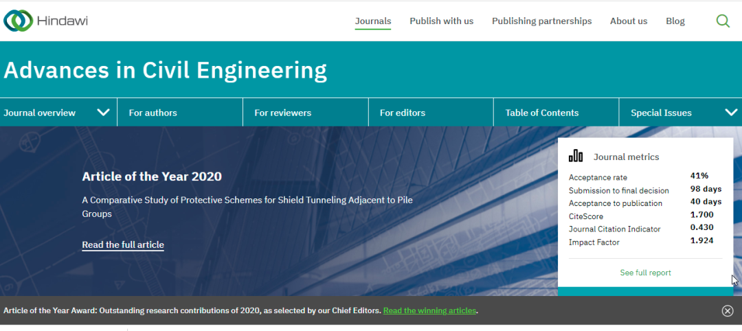 今天,我们来看看这本SCI期刊:Advances in Civil Engineering。从现有的记录来看,Advances in Civil Engineering 的2021年影响因子(JCR2020)是1.924,自引率21.73%。