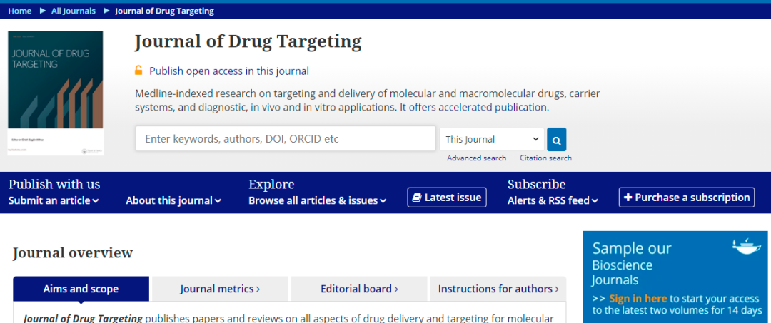 JOURNAL OF DRUG TARGETING 的收稿范围,期刊是如此介绍的(截取部分内容),详情请阅读: