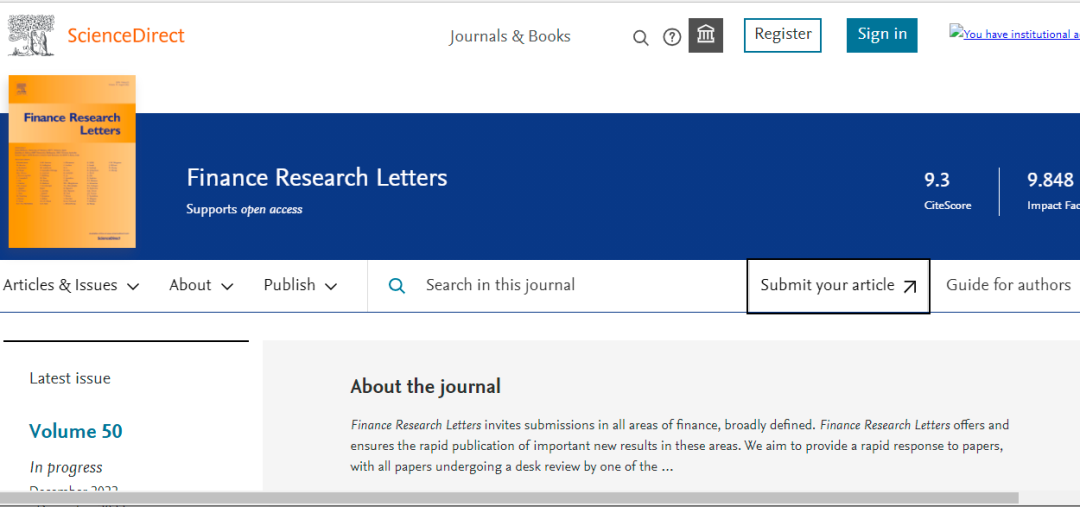 今天,我们来看看这本SCI期刊:Finance Research Letters。从现有的记录来看,Finance Research Letters 的2022年影响因子(JCR2021)是9.848,2021年影响因子5.596,2020年影响因子3.527。