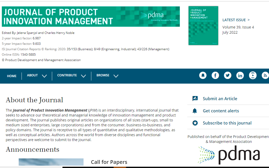 TheJournal of Product Innovation Managementis an interdisciplinary, international journal that seeks to advance our theoretical and managerial knowledge of innovation management and product development. The journal publishes original articles on organizations of all sizes (start-ups, small to medium sized enterprises, large corporations) and from the consumer, business-to-business, and policy domains. The journal is receptive to all types of quantitative and qualitative methodologies. Authors across the world from diverse disciplines and functional perspectives are welcome to submit to the journal, as well as conceptual articles. Authors across the world from diverse disciplines and functional perspectives are welcome to submit to the journal.