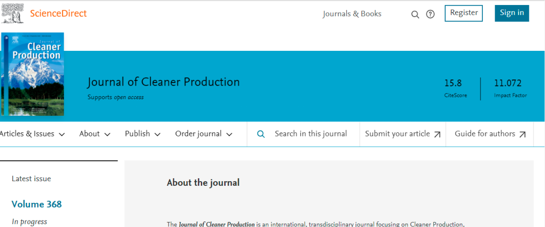 今天,我们来看看这本SCI期刊:Journal of Cleaner Production。从现有的记录来看,Journal of Cleaner Production 的2022年影响因子(JCR2021)是11.072,2021年影响因子9.297,2020年影响因子7.246。