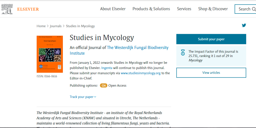 今天,我们来看看这本SCI期刊:STUDIES IN MYCOLOGY。从现有的记录来看,STUDIES IN MYCOLOGY 的2022年影响因子(JCR2021)是25.731,2021年影响因子16.097,2020年影响因子9.027。