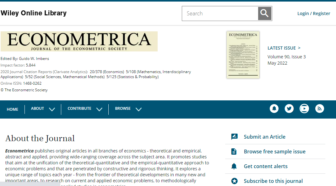 Econometricapublishes original articles in all branches of economics - theoretical and empirical, abstract and applied, providing wide-ranging coverage across the subject area. It promotes studies that aim at the unification of the theoretical-quantitative and the empirical-quantitative approach to economic problems and that are penetrated by constructive and rigorous thinking. It explores a unique range of topics each year - from the frontier of theoretical developments in many new and important areas, to research on current and applied economic problems, to methodologically innovative, theoretical and applied studies in econometrics.