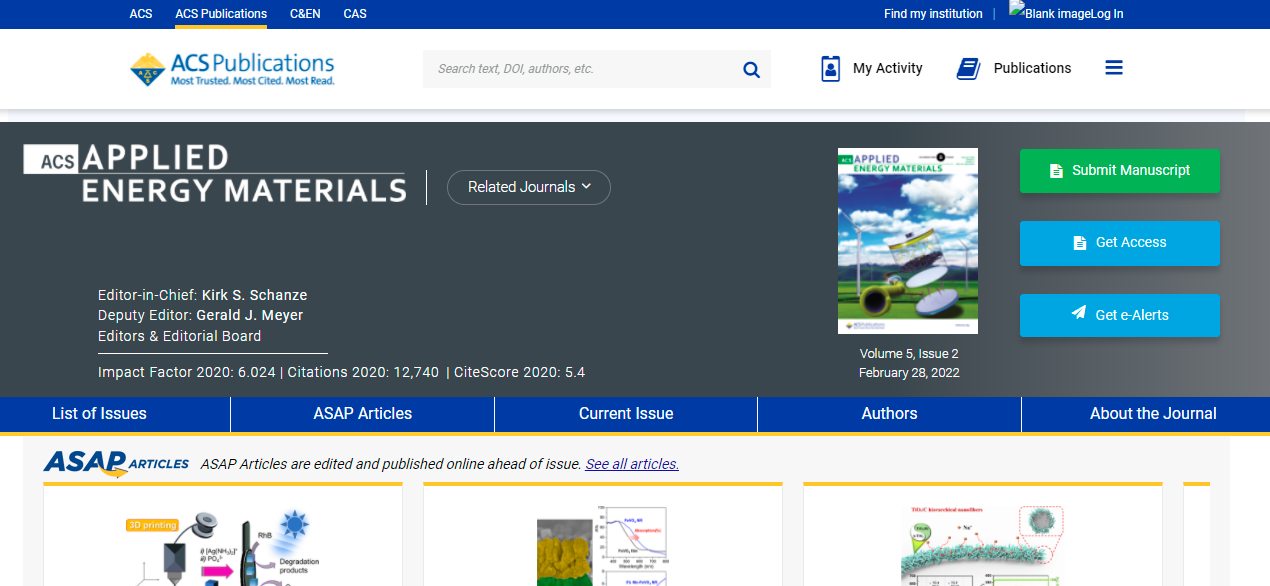 ACS Applied Energy Materials is an interdisciplinary journal publishing original research covering aspects of materials, engineering, chemistry, physics, and biology relevant to sustainable applications in energy conversion and storage. Sample research topics that span the journal's scope for energy storage applications include electrode and membrane materials for solid state batteries, fuel cells, supercapacitors, and redox flow batteries. Topics in energy conversion applications include new inorganic, hybrid, catalytic, and/or organic materials for thermoelectrics, photovoltaics, and photo-electrosynthesis cells.
