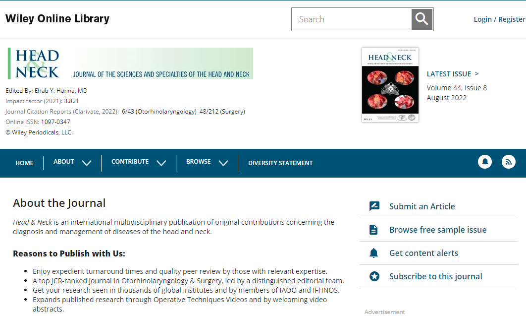Head & Neckis an international multidisciplinary publication of original contributions concerning the diagnosis and management of diseases of the head and neck. This area involves the overlapping interests and expertise of several surgical and medical specialties, including general surgery, neurosurgery, otolaryngology, plastic surgery, oral surgery, dermatology, ophthalmology, pathology, radiotherapy, medical oncology, and the corresponding basic sciences.