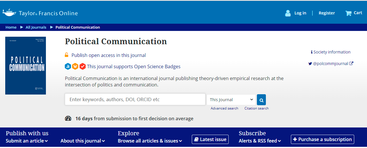Political Communication is an international journal, published quarterly, that features cutting-edge theory-driven empirical research at the intersection of politics and communication. Its expansive subject is the site of rapid changes and pressing policy concerns worldwide. The journal welcomes all research methods and analytical viewpoints that advance understanding of the practices, processes, content, effects, and policy implications of political communication. Regular symposium issues explore key issues in depth.
