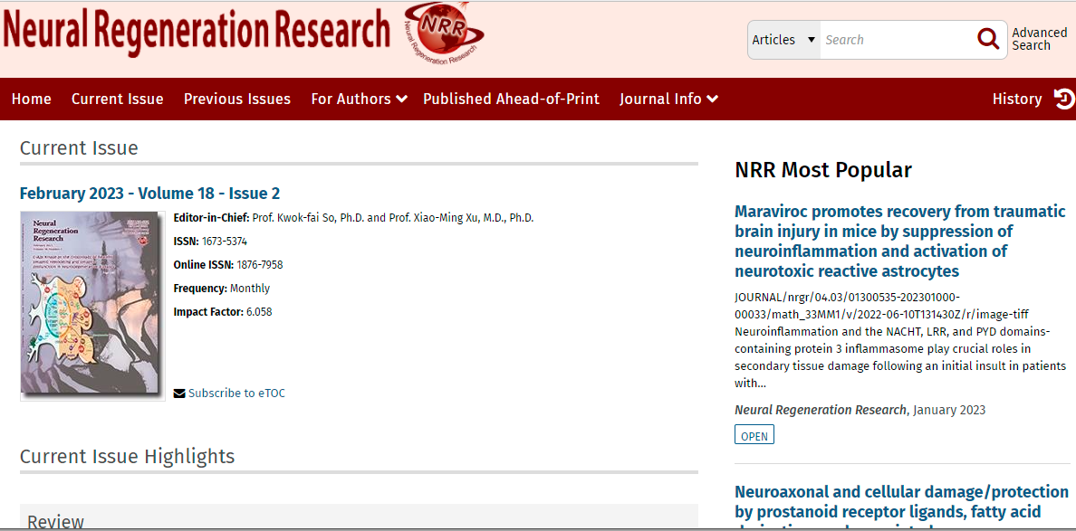 Neural Regeneration Research(NRR), a publication of Chinese Association of Rehabilitation Medicine (CARM),is a peer-reviewed open-accessed journal published with monthly. NRR aims to duly report the prospective, creative, and popular basic and clinical research in the international field of neuroregeneration. NRR focuses on rapidly publishing the articles pertaining to brain injury, spinal cord injury, peripheral nerve injury, neurodegenerative diseases, and neuroimaging, which reflect the latest progress in neuroregeneration research, and aims to highlight the unique scientific characteristics of each article.