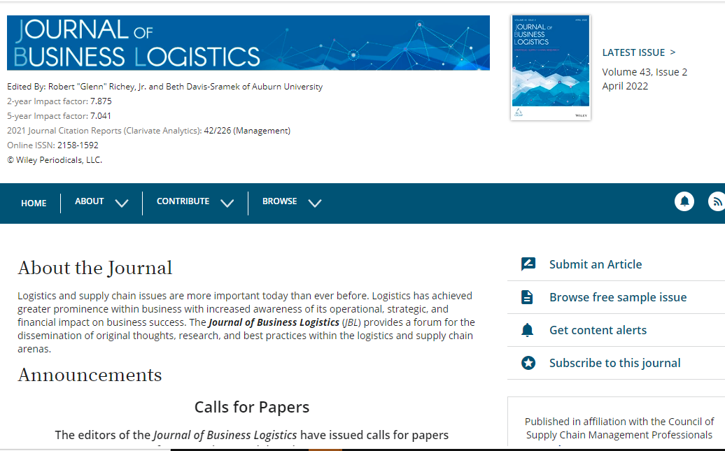 今天,我们来看看这本SCI期刊:Journal of Business Logistics。从现有的记录来看,Journal of Business Logistics 的2022年影响因子(JCR2021)是7.857,2021年影响因子6.677,2020年影响因子4.697。