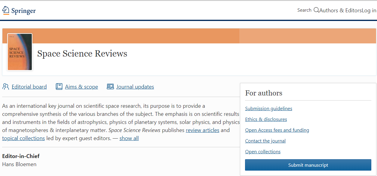 Space Science Reviews (SSR) is an international journal on scientific space research. Its purpose is to provide a contemporary synthesis of the various branches of space research, with emphasis on scientific results and instruments in the fields of astrophysics, physics of planetary systems, solar physics, and physics of magnetospheres & interplanetary matter. SSR publishes invited reviews and topical collections. SSR does not publish original research articles.