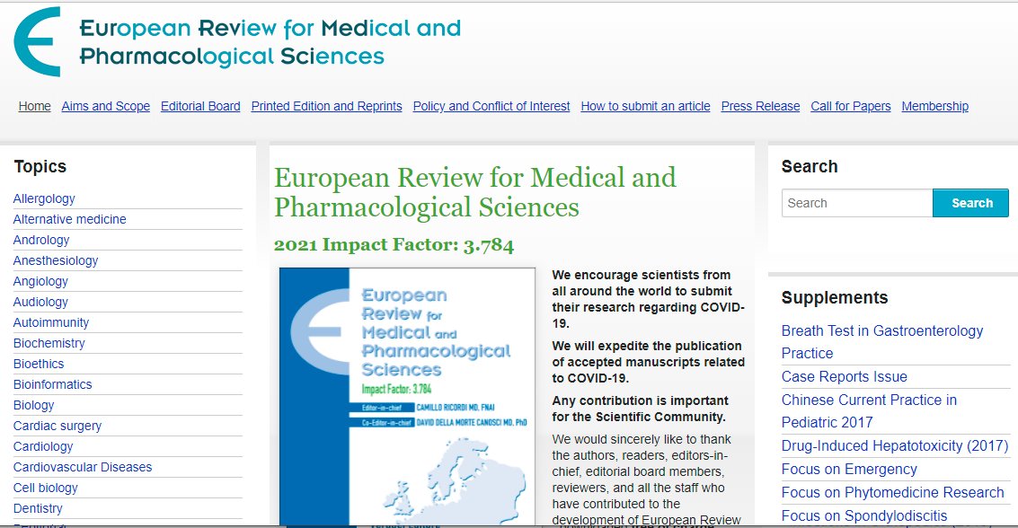 EuropeanReview forMedical andPharmacologicalSciences, a fortnightly journal, acts as an information exchange tool on several aspects of medical and pharmacological sciences. It publishes reviews, original articles, and results from original research.