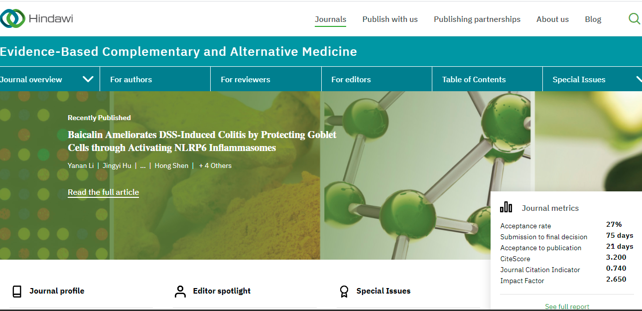 今天,我们来看看这本SCI期刊:Evidence-based Complementary and Alternative Medicine。从现有的记录来看,Evidence-based Complementary and Alternative Medicine 的2022年影响因子(JCR2021)是2.650,2021年影响因子2.629,2020年影响因子1.831。