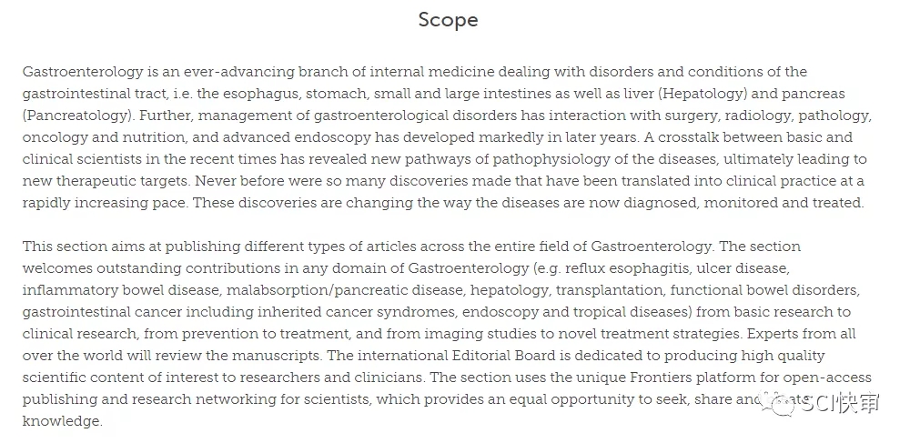 Frontiers in Medicine发表整个胃肠病学领域的不同类型的文章,包括胃肠病学的任何领域(例如反流性食管炎、溃疡病、炎症性肠病、吸收不良/胰腺疾病、肝病学、移植、功能性肠病、胃肠道癌症,包括遗传性癌症综合征、内窥镜检查和热带病)的基础研究做出杰出贡献到临床研究,从预防到治疗,从影像学研究到新的治疗策略。