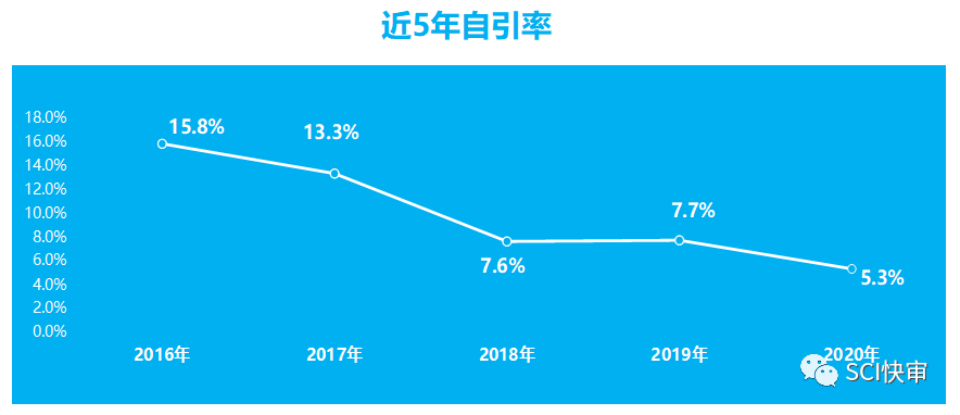 International Journal of Medical Informatics近5年自引率均控制在16%以下,从2015年开始自引率逐年下降,2019自引率为7.7%,2020年自引率为5.3%,总的来说自引率相对较低,现在不用有自引率方面的担忧。