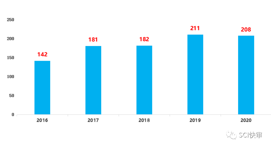 International Journal of Medical Informatics近5年发文量整体呈上升趋势,整体变化不算大,从2016年至2018年的发文量均为一百多篇,2019年开始突破200篇;2020年与2019年基本持平;美国发文量最多,中国发文第三,国人发文较少。