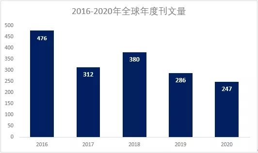 根据以上图表数据可以看到,2016-2020年OncoImmunology 期刊全球发文量总计1,701篇,整体来看,近5年期刊年度发文量虽然有一些幅度变化,但平均每年始终保持在200篇以上,发文体量依旧比较大。