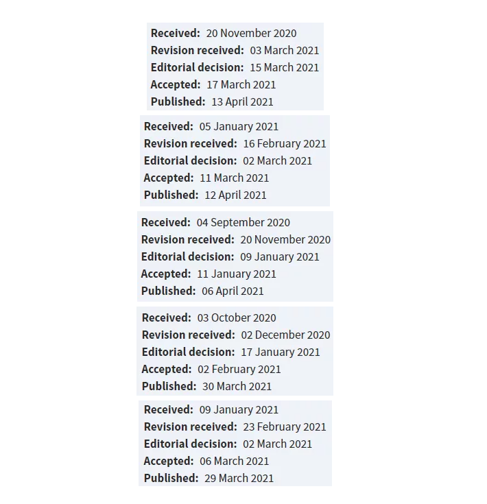 我们来看几篇今年发表的论文,平均2-3个月左右接受,当然有的快一些,有的相对慢一些。整体来说,发文速度比较快。