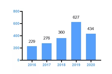 2016 (229),2017 (276),2018 (360),2019 (627),2020 (434)