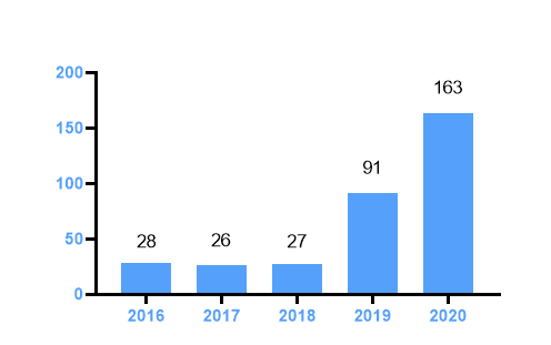 2016 (28),2017 (26),2018 (27),2019 (91),2020(163)