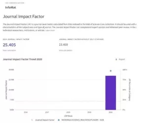 InfoMat为电子科技大学与Wiley出版集团合作的开放获取式期刊,于2019年正式创刊,由李言荣院士担任主编。期刊2019年6月被国际最大的开放获取期刊目录DOAJ收录,2020年5月被ESCI收录,7月入选“中国科技期刊卓越行动计划2020年度高起点新刊项目”,11月被SCIE收录。目前,InfoMat已被SCIE收录158篇文章,总被引频次2,789次,H指数29,今年的首个SCIE影响因子就达到了25.405。