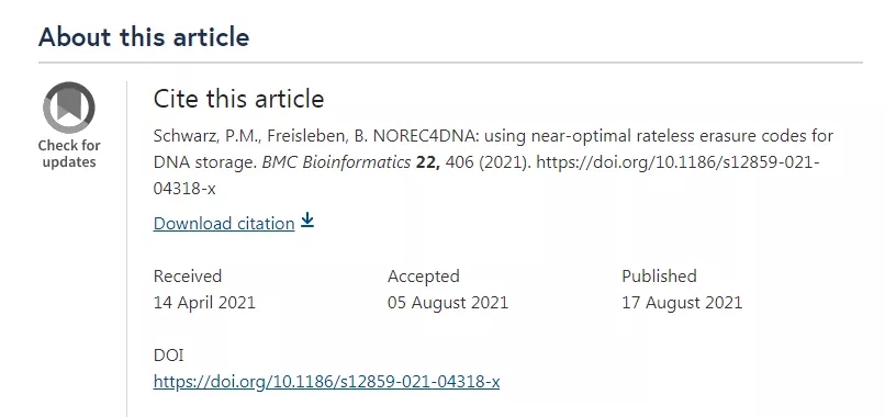 第二篇文章“NOREC4DNA: using near-optimal rateless erasure codes for DNA storage”于2021年04月14号投稿,2021年08月05日接收,从投稿到接收用时3个多月时间。