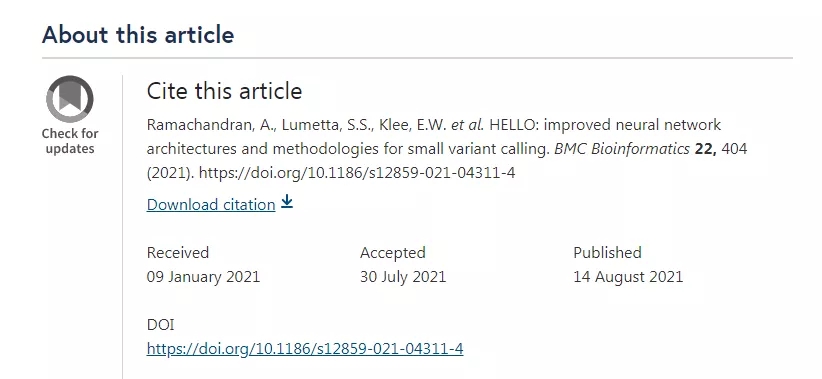 第一篇文章“HELLO: improved neural network architectures and methodologies for small variant calling”于2021年01月09号投稿,2021年07月30日接收,从投稿到接收用时6个多月的时间。