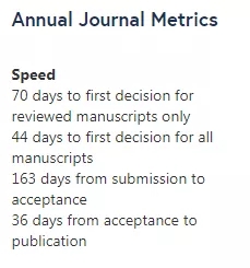 以下是在官网随机搜索了近期发表的几篇文章,从投稿到接收最快的1天就接收了,大多文章基本在3~6个月左右,较长的用时9个月+;接收后到在线发表比较快,都基本在 2周左右。