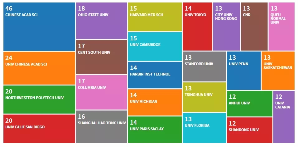 从发文机构来看,发文量前三的均为国内机构,发文量位居第一位的是中科院 46篇,占比约 2.763;其次是中国科学院大学共24篇,占比约 1.441%;西北工业大学20篇,位居第三位,占比约1.201%。