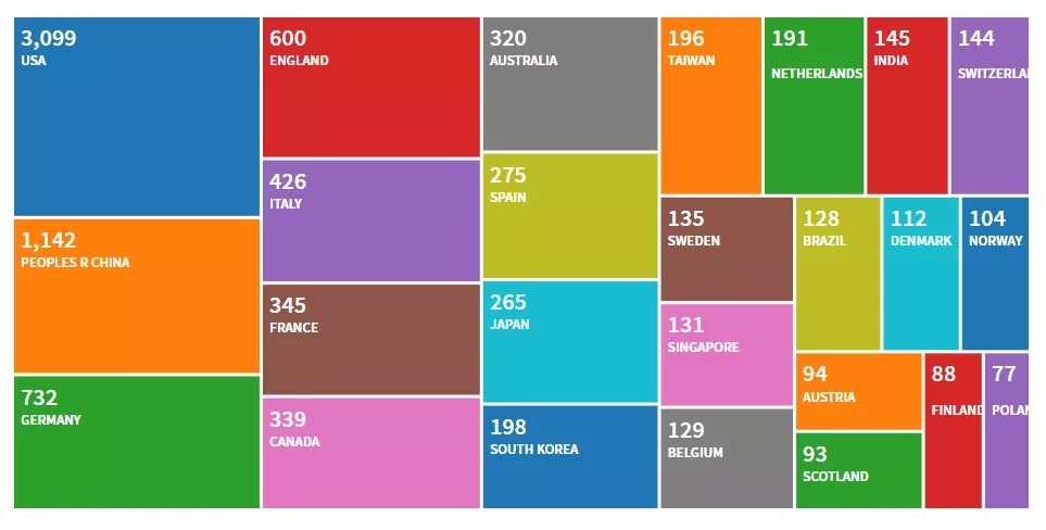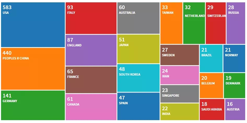 根据Web of Science收录的论文来看,目前发文量最多的是美国学者3099篇,占比约40%,其次是中国学者1142篇,占比约15%。分析了从2019年至今(2021年8月21日)目前发文量最多的仍为美国学者,共583篇,占比35%左右,中国学者这两年的发文量上升,共440篇,占比上升至26%左右!
