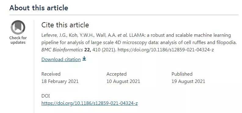 第四篇文章“LLAMA: a robust and scalable machine learning pipeline for analysis of large scale 4D microscopy data: analysis of cell ruffles and filopodia”于2021年02月18号投稿,2021年08月10日接收,从投稿到接收用时5个多月时间。