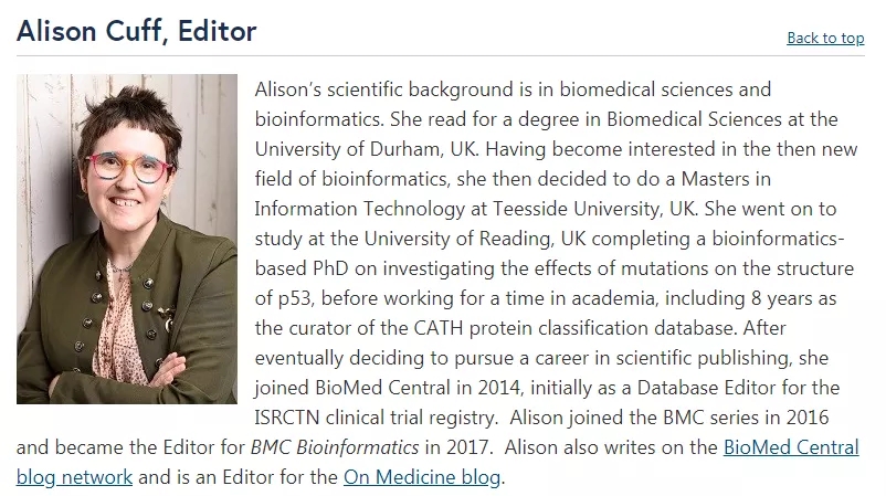 期刊主编为Alison Cuff,来自英国杜伦大学,是一名有生物医学和生物信息学背景的专家,她于2014年加入BioMed Central,后于2016年加入BMC系列,并于2017年成为BMC Bioinformatics的编辑。编委会其他成员也几乎都是生物信息学领域的专家学者。
