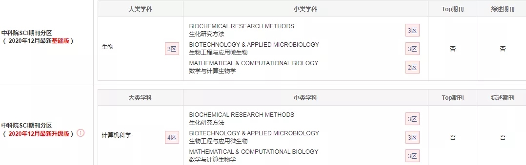 BMC Bioinformatics在中科院分区(最新基础版):大类学科生物学3区,小类学科生化研究方法3区,生物工程与应用微生物3区,数学与计算生物学2区,非TOP期刊,非综述期刊。