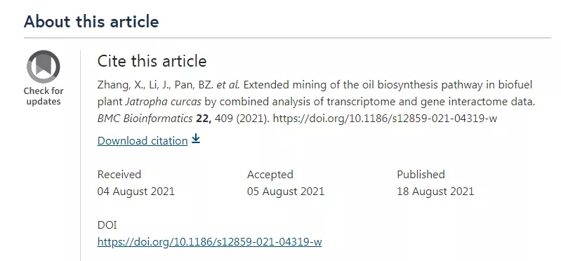 第三篇Research类型的文章Extended mining of the oil biosynthesis pathway in biofuel plant Jatropha curcas by combined analysis of transcriptome and gene interactome data”于2021年08月04号投稿,2021年08月05日接收,从投稿到接收,用时仅仅1天,这是秒接收,接收后到在线发表也不到2周时间。
