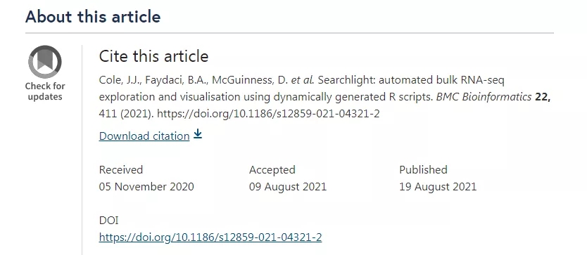 第五篇 文章“ Searchlight: automated bulk RNA-seq exploration and visualisation using dynamically generated R scripts”于2020年11月05号投稿,2021年08月09日接收,从投稿到接收用时9个月左右时间,从接收后到在线发表仅用时10天时间。