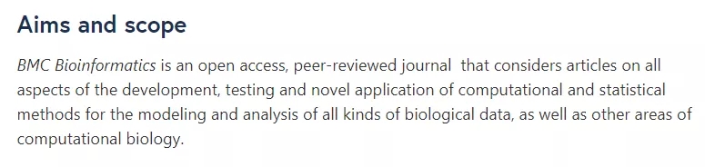 BMC Bioinformatics是一本完全开放获取、同行评议的期刊,主要发表各种生物数据建模,生物数据的分析和统计方法的开发、测试和新应用的各个方面的文章,以及计算生物学其他领域的文章。