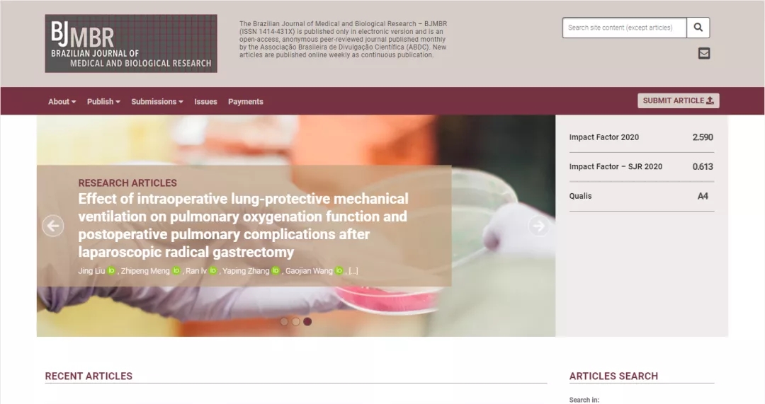 今天我们要和大家分享的期刊是:Brazilian Journal of Medical and Biological Research,简称BJMBR,创刊于1981年,是一份开放获取、匿名同行评审的杂志,由Associação Brasileira de Divulgação Científica (ABDC)出版社以月刊的形式发行,其ISSN号与e-ISSN号分别为0100-879X、1414-431X。研究方向:儿科,免疫,临床,血液,分子生物学,微生物。最新影响因子为2.590。