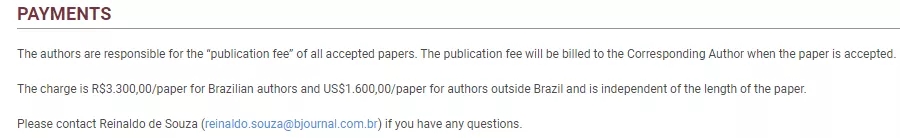 在Brazilian Journal of Medical and Biological Research发表文章,一经被录用,非巴西作者,需要支付1600美元出版费,约合人民币10400元,与其他2-3分的OA期刊相比,期刊的版面费价格不高也不低。